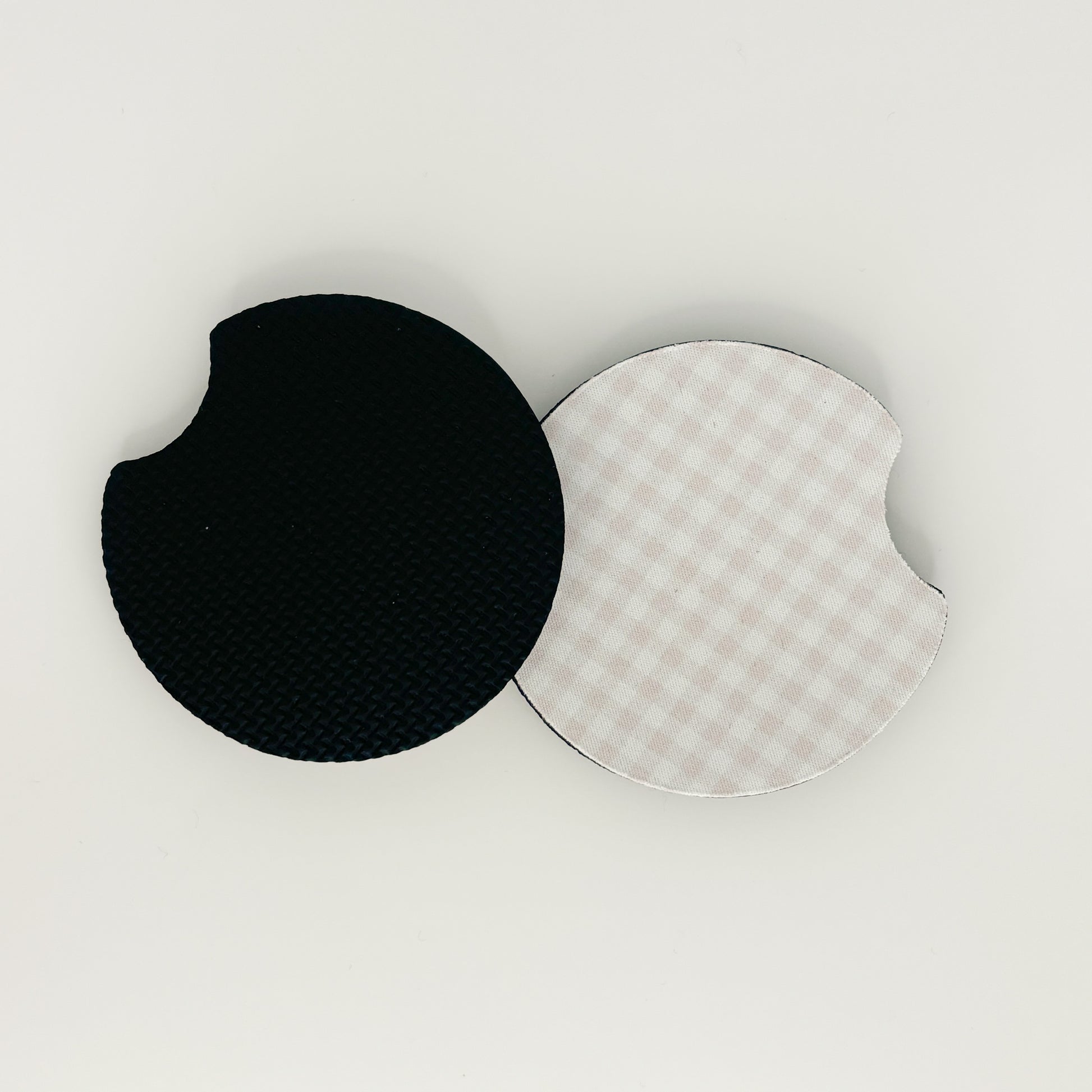 set of two car coasters — each one measures 2.75 inches wide and 0.25 inches thick, perfectly sized to fit most standard cup holders. made from soft neoprene with a non-slip rubber base and smooth fabric top for a comfy, durable feel. each coaster has a small finger notch for easy removal and adds a cute, stylish touch to your car.