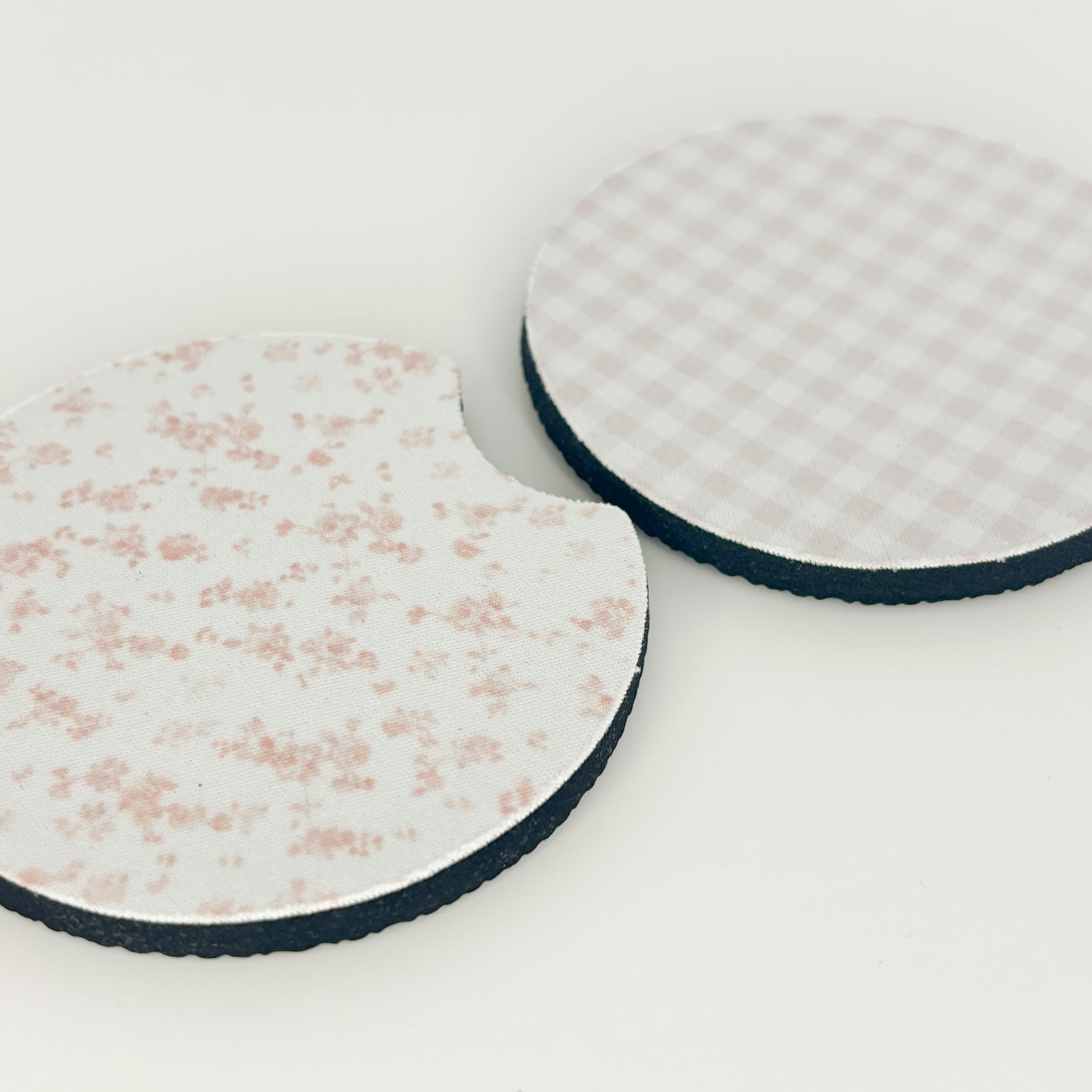 set of two car coasters — each one measures 2.75 inches wide and 0.25 inches thick, perfectly sized to fit most standard cup holders. made from soft neoprene with a non-slip rubber base and smooth fabric top for a comfy, durable feel. each coaster has a small finger notch for easy removal and adds a cute, stylish touch to your car.