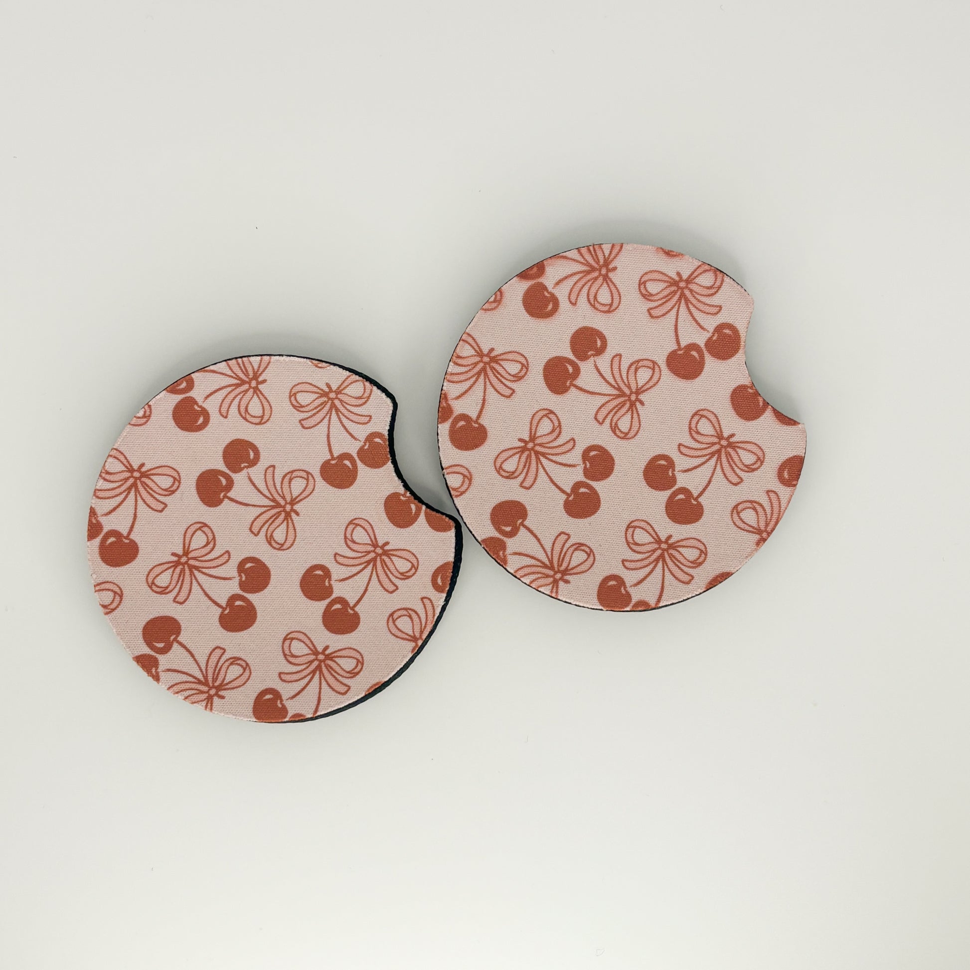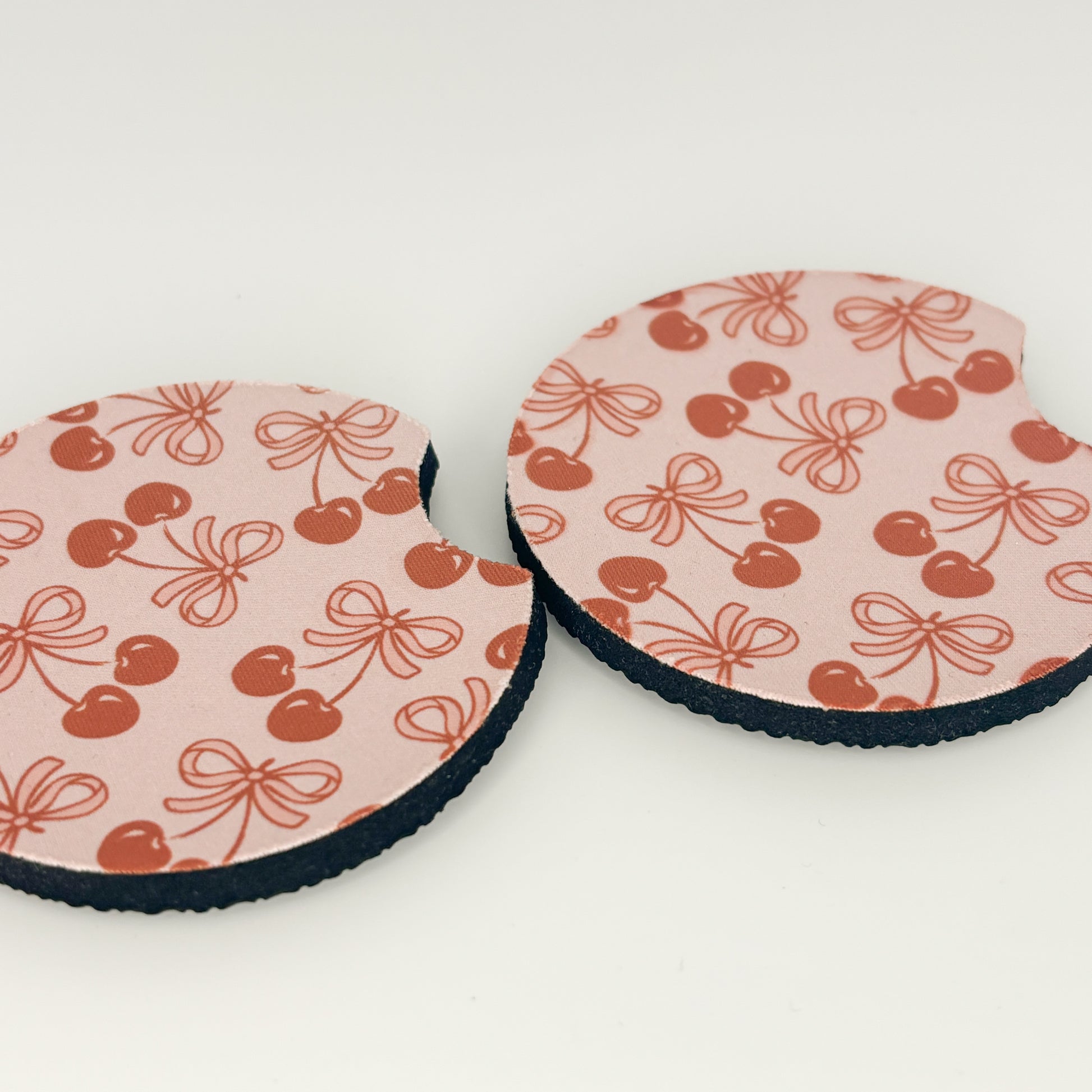 set of two car coasters — each one measures 2.75 inches wide and 0.25 inches thick, perfectly sized to fit most standard cup holders. made from soft neoprene with a non-slip rubber base and smooth fabric top for a comfy, durable feel. each coaster has a small finger notch for easy removal and adds a cute, stylish touch to your car.